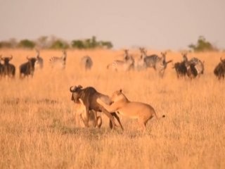 Sürüyü izleyen aslanlara yem olan şanssız Öküz başlı antilop, ne kadar çabalasada hedef olmaktan kurtulamadı.