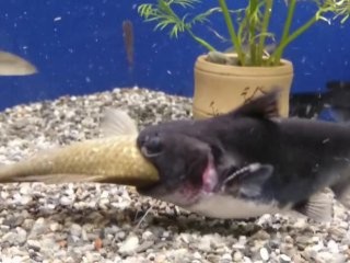 Bir süs akvaryumunda 'asterophysus batrachus' türü bir yayın balığı, yavrularının yanında anne balığı avladı.