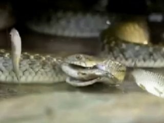 Görüntülerde, bir kayanın altında gizlenen avcı yılanlar, gözlerine kestirdiği balıkları hızlı bir hamleyle yakalayarak karnını doyuruyor.