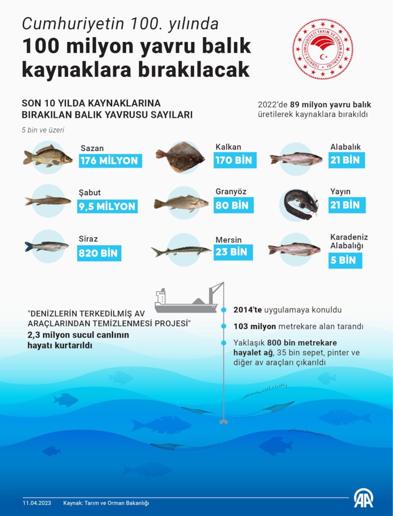 Tarım ve Orman Bakanlığı, Su Kaynaklarının Balıklandırılması Projesi çerçevesinde Cumhuriyetin 100’üncü yılında 100 milyon yavru balık üreterek kaynaklara bırakacak. Bakanlık, üretim hazırlıklarına da başladı.