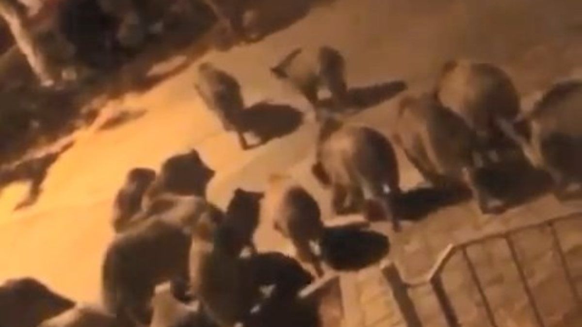 İHA'nın haberine göre domuz sürüsü, çöp konteynerlerinde yiyecek aradı.