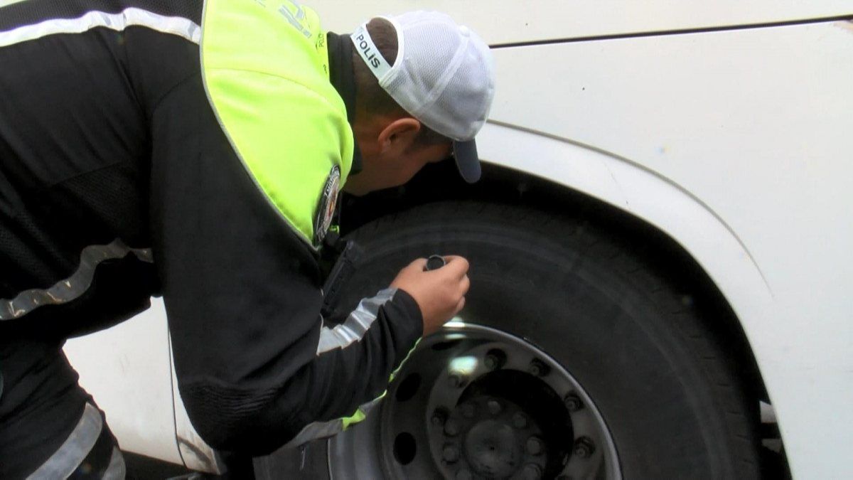 Öte yandan ekipler lastiklerin diş derinlikleri ile genel durumunu incelerken, yolculara da broşür dağıtıldı.