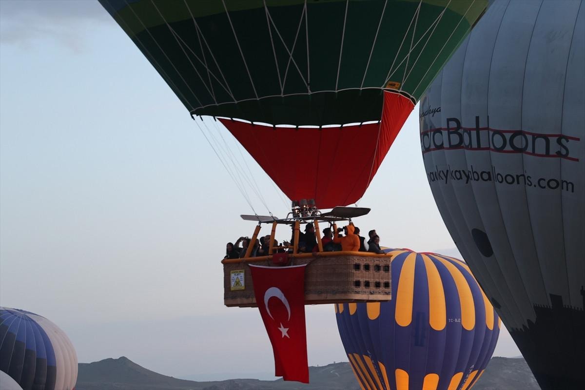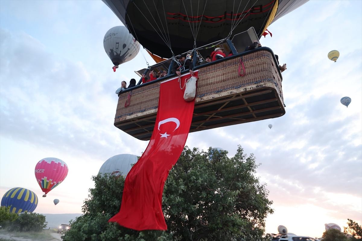 Türkiye'nin doğal, tarihi ve kültürel zenginlikleriyle tanınan Kapadokya'da turistlerin bölgeyi kuşbakışı izlemelerine imkan sunan sıcak hava balonları, Türk bayraklarını gökyüzünde dalgalandırdı.