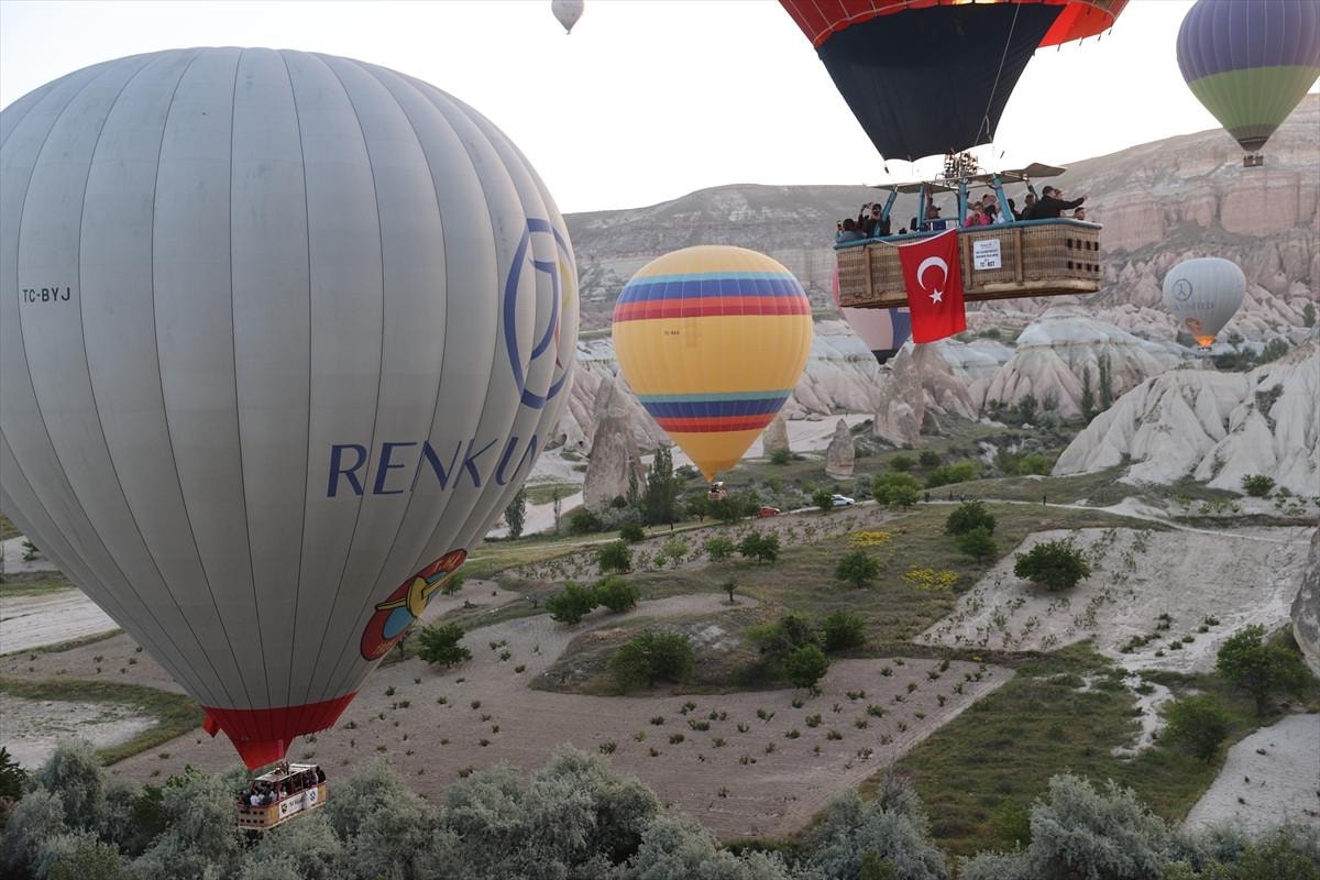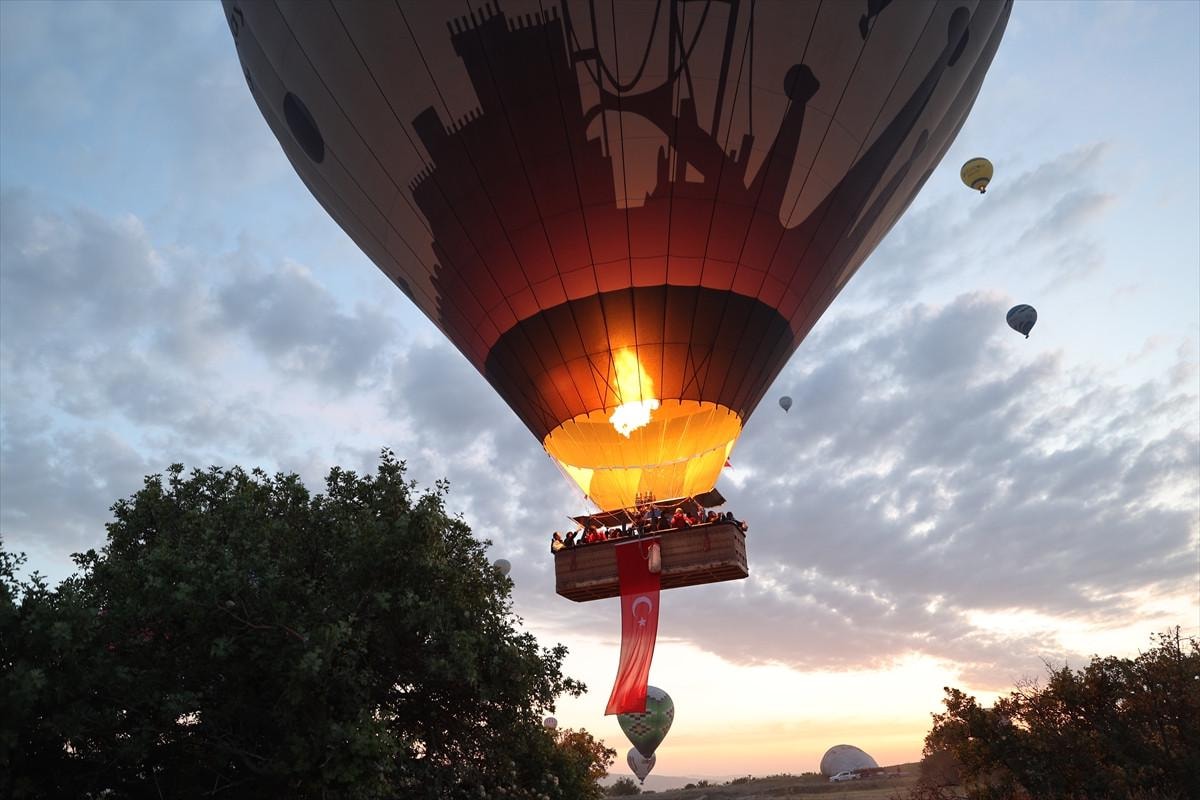 Sıcak hava balonları bugünkü gezilerine al yıldızlı bayraklarla donanarak başladı.