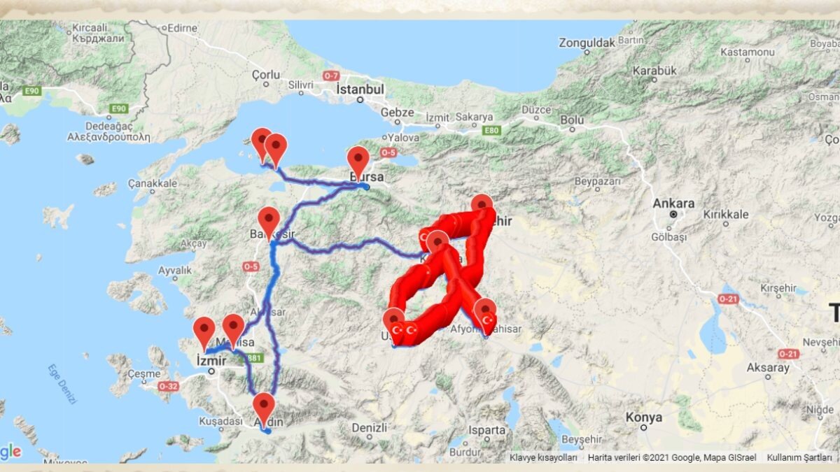 "Zafer Yolumuz" haritasında şehirler, düşman işgalinden kurtulma tarihlerine göre sıralanıyor.