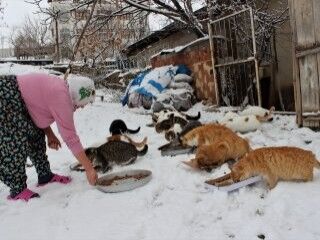 5 yıldır kedilere baktığını belirten Nuriye Yücesoy, "İlk başlarda 1 anne 3 yavru kediye bakıyordum. Hayvanlar kış mevsiminde üşüyor. Yaz kış hayvanlara bakıyorum. Kışın hepsine bakıyorum. Kedileri dışarıda bırakmaya vicdanım el vermedi. Ahşaptan küçük bir evimiz olduğu için kedilere bakmaya zorlanıyorum. Yazın da sıcak havadan dolayı dışarıda kalıyorlar. Alıyorum bakıyorum. Bakımları çok zor. Ben de yaşlandım artık, kedilere bakmakta zorlanıyorum. Hayvanlar, kışın soğuktan yazın da sıcaktan perişan oluyor. Bunların hepsi sokak kedisi" dedi.