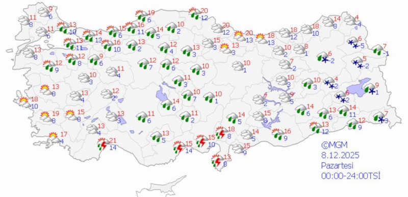 Genellikle yağmur ve sağanak, Ege ve Akdeniz kıyılarında gök gürültülü sağanak, Doğu Anadolu'nun batısının yükseklerinde karla karışık yağmur şeklinde görülecek olan yağışların; Batı Akdeniz, İzmir ve Aydın kıyıları ile Denizli'nin güney ilçelerinde kuvvetli, Antalya ve Muğla çevrelerinde yerel çok kuvvetli ve şiddetli olması bekleniyor.