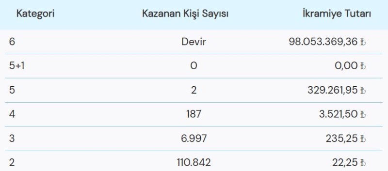 Büyük ikramiyenin 98.053.369,36 TL olduğu çekilişte 6 bilen çıkmadığı için ikramiye devretti. Yapılan çekiliş sonuçlarına göre 5 bilen iki şanslı vatandaş 329.261,96 TL'lik ödül kazandı.