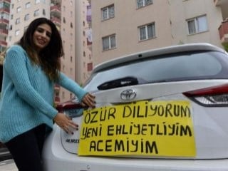 Otomobilinin arkasına "yeni ehliyetliyim, acemiyim" yazısını astı VİDEO