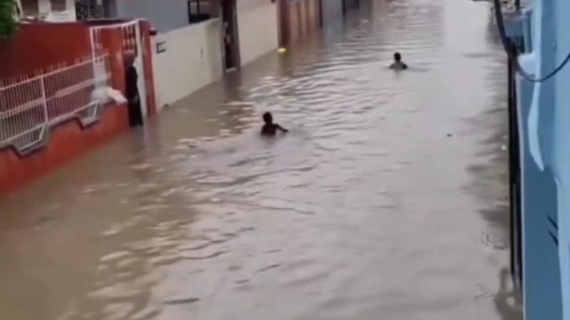 Çocuklar su basan sokaklarda yüzdü