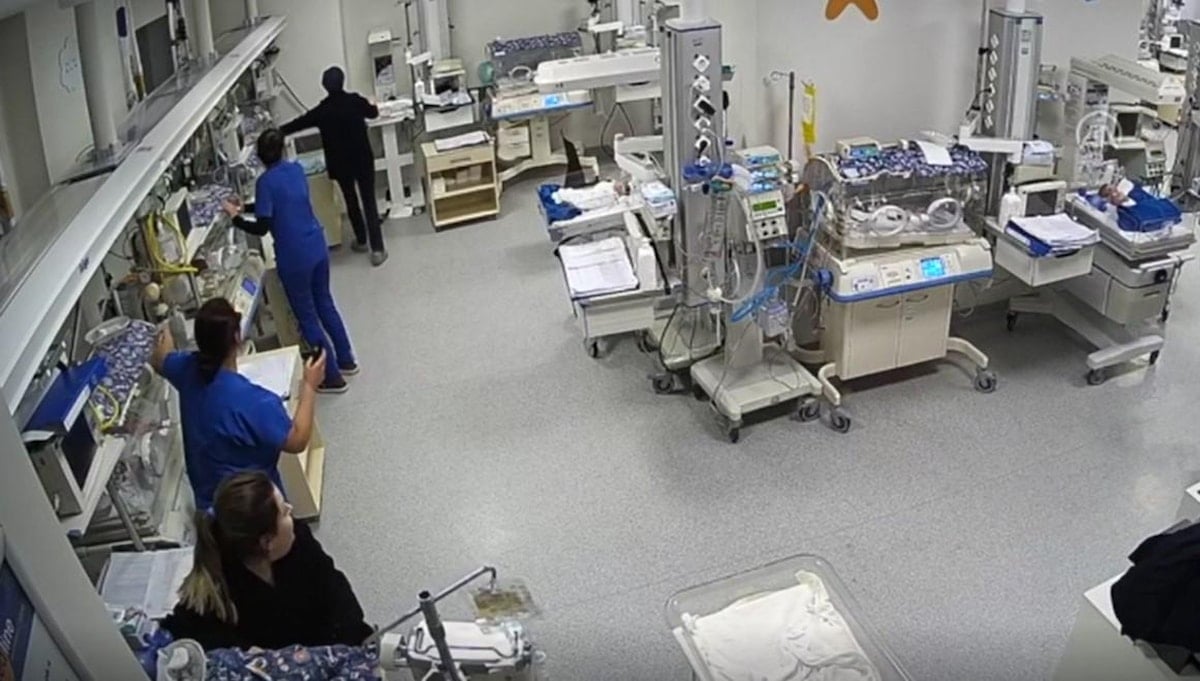 Yenidoğan yoğun bakım bölümünün güvenlik kamerasına yansıyan olayda; depremin başlamasıyla hemşireler kuvözlere yöneliyor.