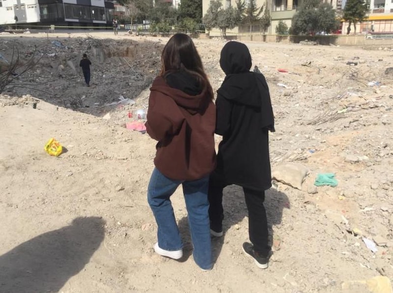 Anne, oğlu ve kızı, yıkılan binanın yerine gelerek gözyaşlarına tutamadı. Çocuklar binadan kalan enkaza girerek eşyalarını bulup annelerine getirdi.