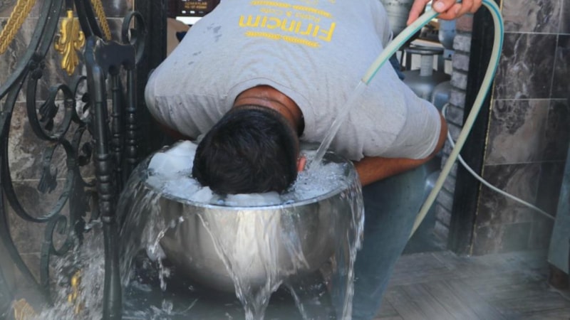 Yazın bol bol soğuk içecek tükettiklerini kaydeden ustalar, serinlemek için ise kafalarını buzlu suya sokup hortumla serinlemeye çalışıyor.