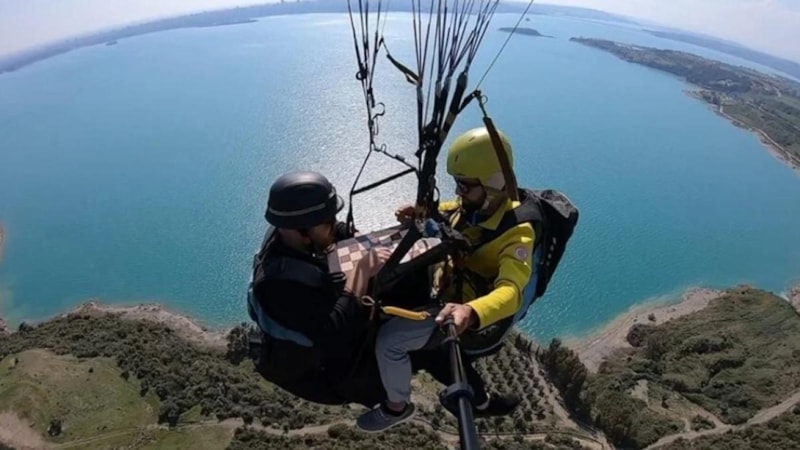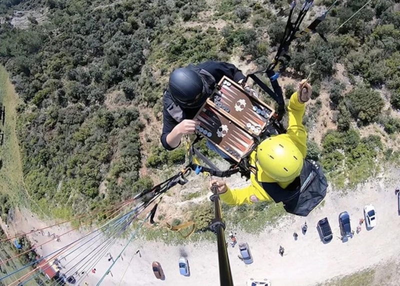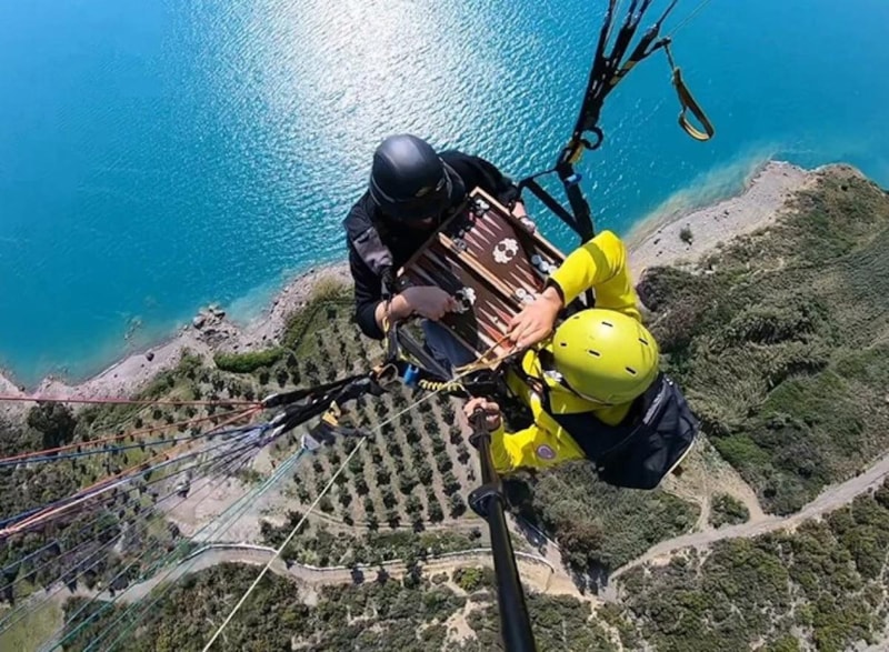 Mehmet Ağırman ve Furkan Nizamsever adlı paraşüt pilotları, gökyüzünde tavla oynarken aksiyon kamerasıyla o anları kaydetti.