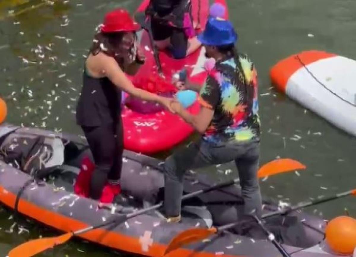 Karnavalda, kanoyla korteje katılan sporculardan Bünyamin Türk, 7 aylık sevgilisi Betül Sakınan’a evlenme teklifi etti.