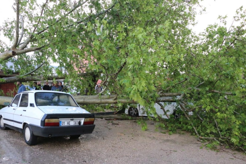Adana'nın Kozan ilçesinde etkili olan sağanak, dolu ve şiddetli fırtına nedeniyle Kozan Belediyesi binası önündeki çınar ağacı yerinden sökülüp, iki otomobilin üzerine devrildi.