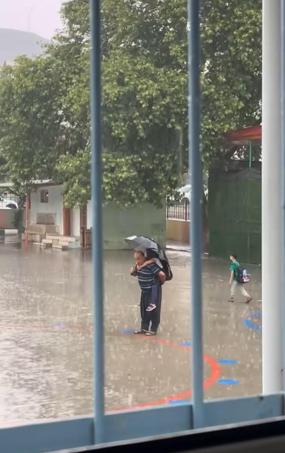 TORUNUNU YAĞMURDAN KORUMAK İÇİN SIRTINA ALDI