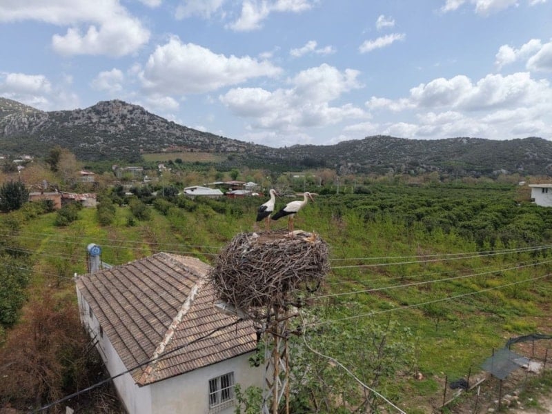 İlçe sakinlerinin yolunu gözledikleri leylekler yuvalarına gelirken aileler, çocukları ile birlikte leylekleri görmek için mahalleye geliyor.