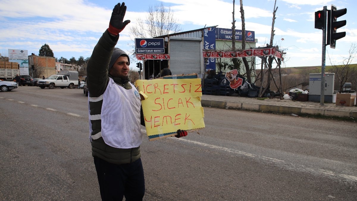 Depremden an çok etkilenen iller arasında bulunan Adıyaman'a gelen kurtarma ekipleri ve hayırseverler, şehre 30 kilometre kala yolun ortasında elinde 'Ücretsiz sıcak yemek' yazılı pankartla karşılanıyor.