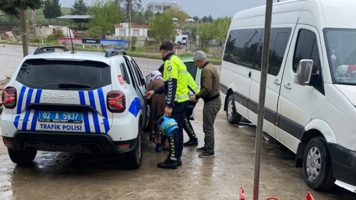 Polis ekipleri, yaşlı kadının ıslanmaması için yaşlı kadını araca bindirerek evine kadar bıraktı.