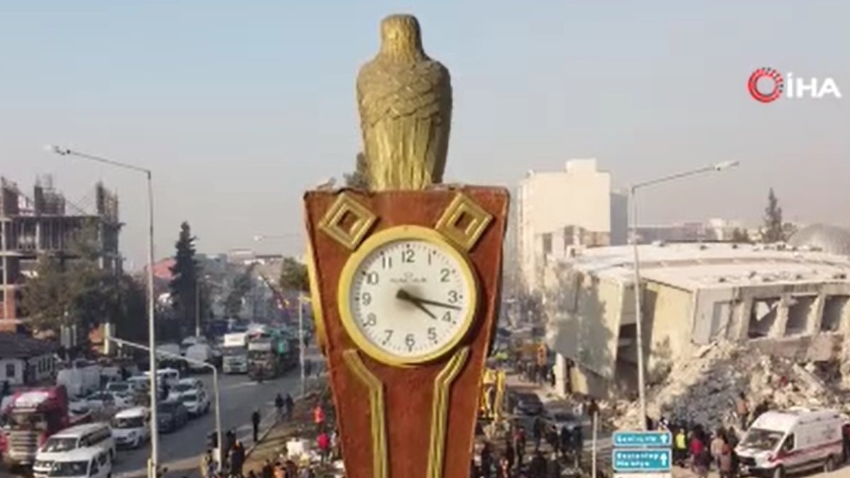 Kentte yıkılmayan nadir yapılardan biri olan kartal figürlü saat kulesi ise deprem anı olan 04.17’de durdu.