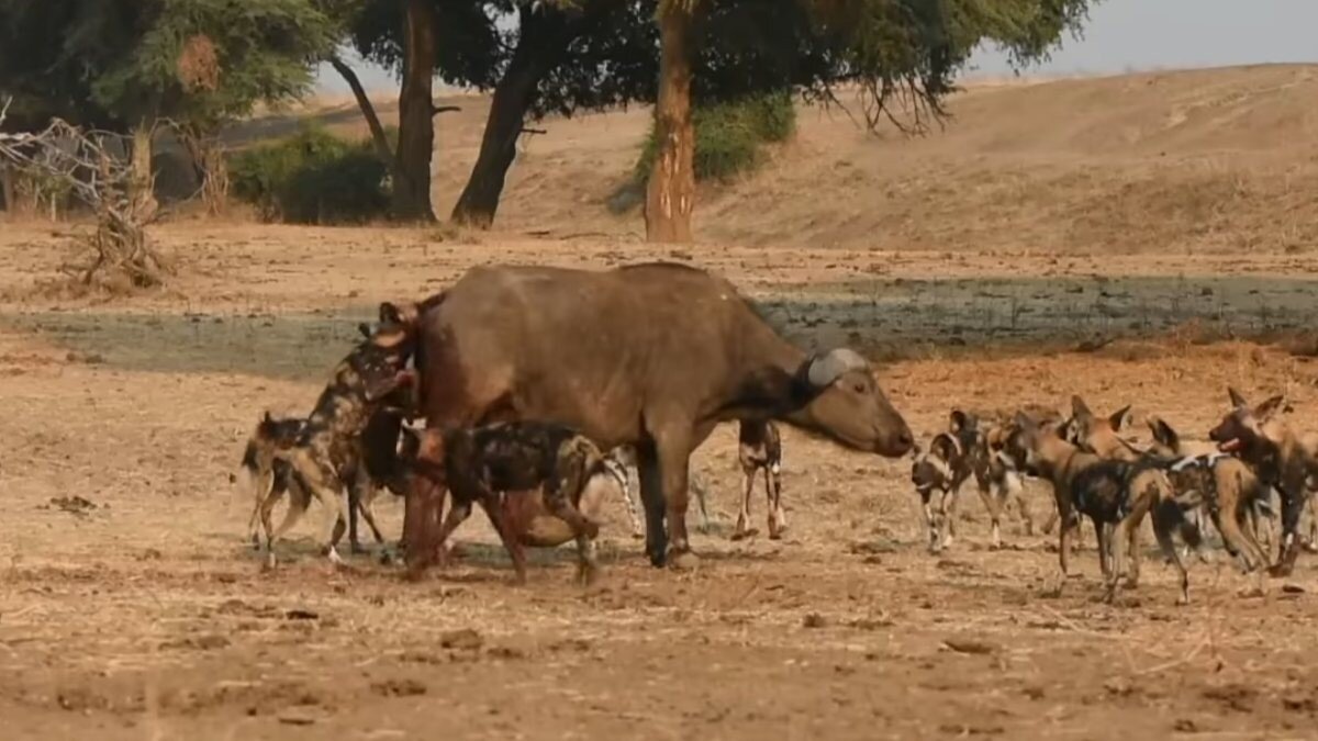 Afrika'daki Aşağı Zambezi Ulusal Parkı'nda yaban köpekleri, büyük bir fıtığı olan bufaloyu gözüne kestirdi.