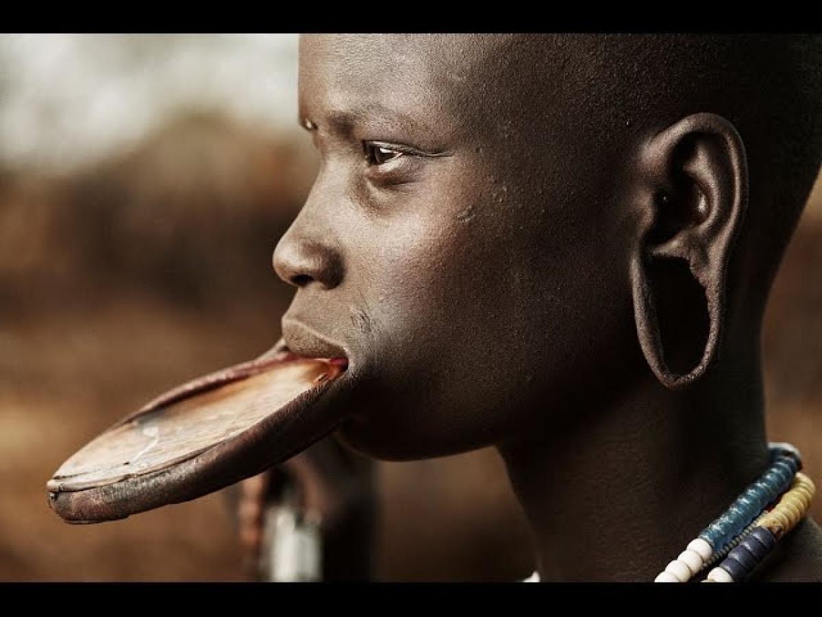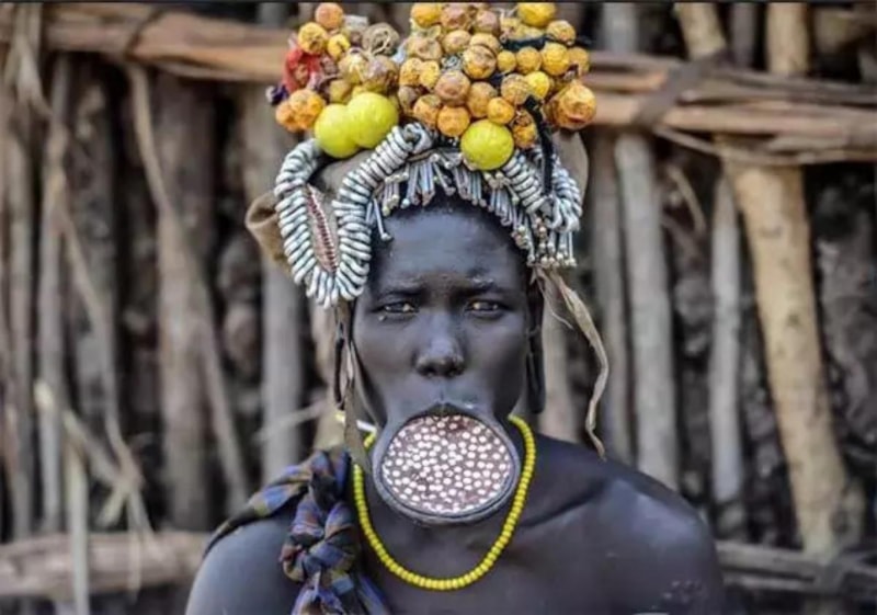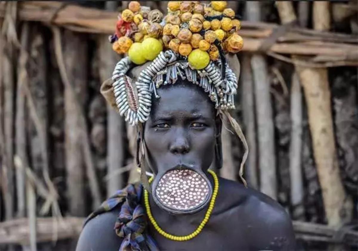 Afrika’nın Mursi kabilesine ait olan garip geleneğe göre kadınların dudakları ne kadar büyük olursa kadının o kadar değerli olacağına inanıldığından kadınlar dudaklarına tabak takarak büyütmeye çalışıyorlar.