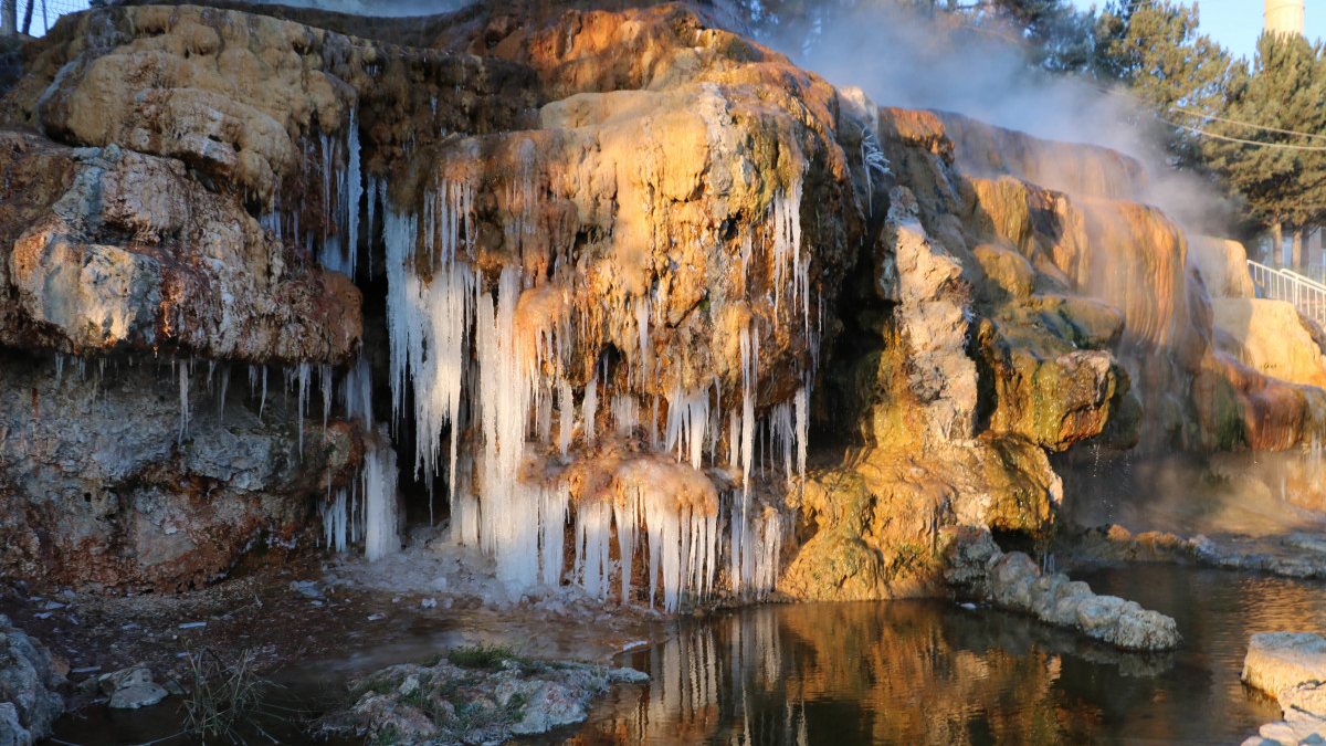 'Şifa Şelalesi' olarak anılan ve 800 metre derinlikten yaklaşık 70 derece sıcaklıkta çıkıp, 60-62 dereceye düşürülerek yapay şelaleye verilen su, kayaların üzerinden akarken dondu.