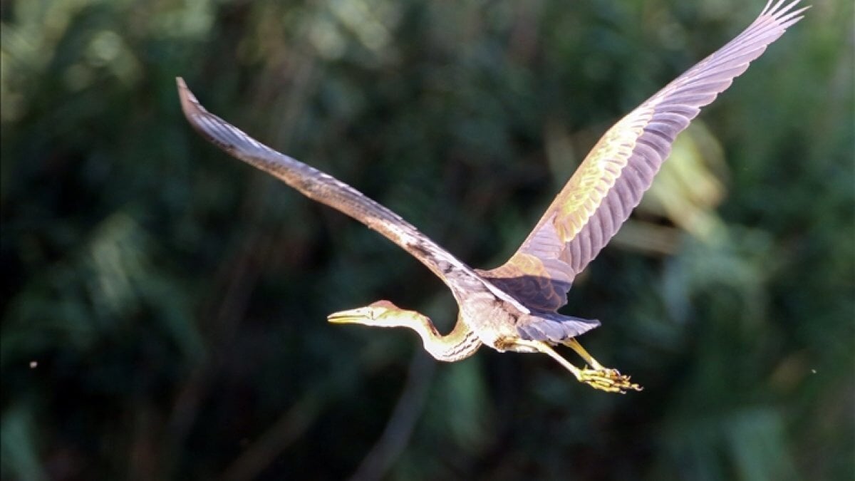 Kuş gözlemcilerinin de en çok görüntülemek istediği, renkleri ve yapısıyla dikkat çeken erguvani balıkçıl, milli parkta AA ekibince görüntülendi.