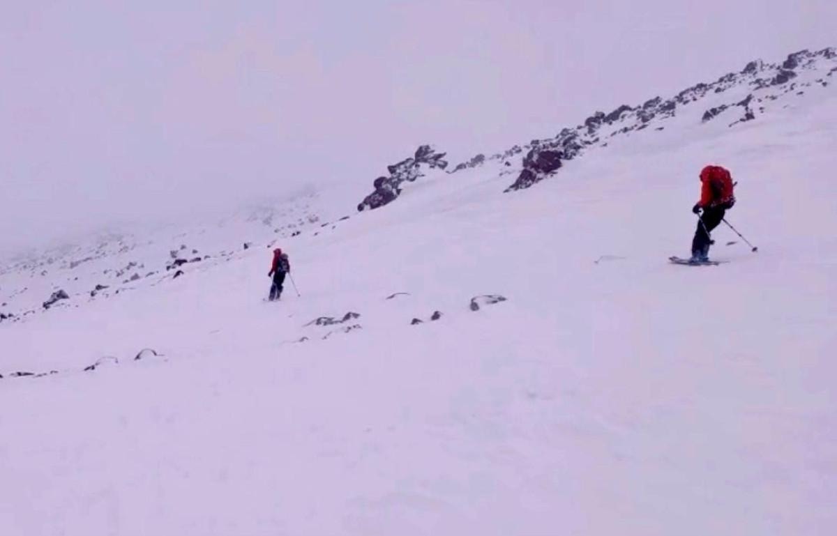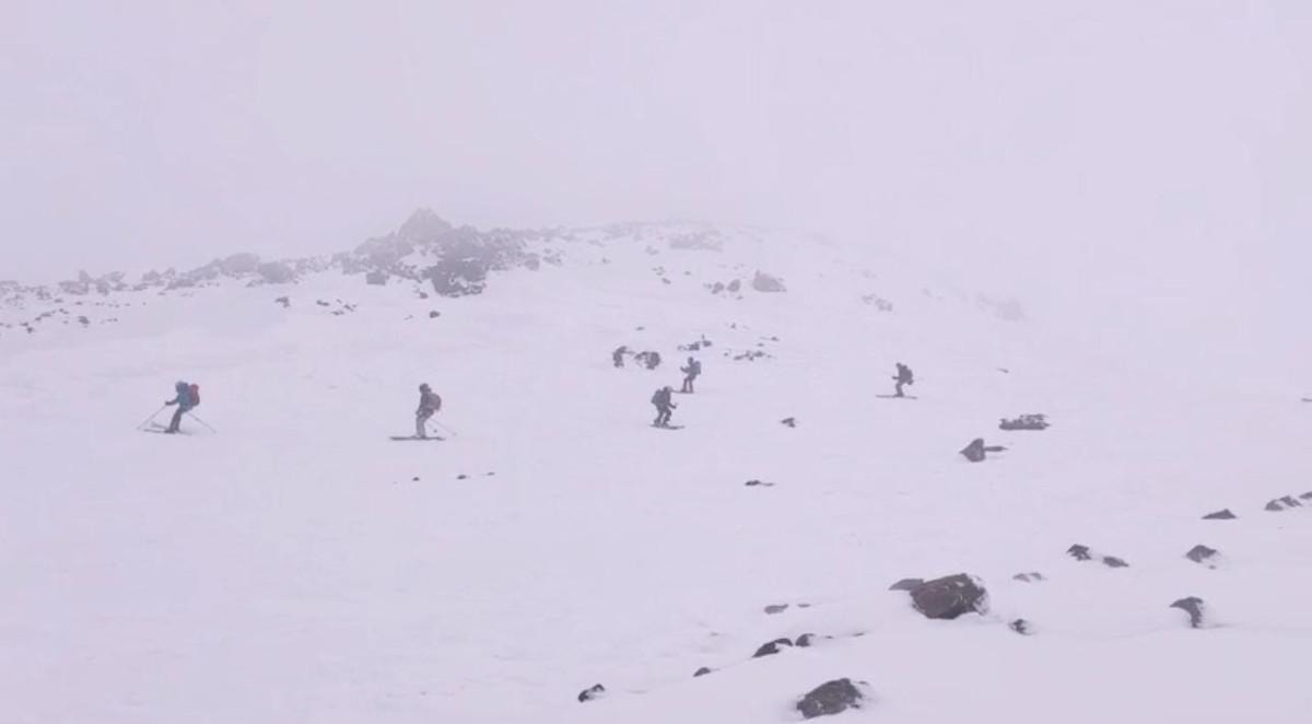 Tipi ve fırtınaya rağmen karla kaplı yamaçlarda kaymaktan vazgeçmeyen grup, adrenalin dolu anlar yaşadıktan sonra zirveye doğru yürüyüşünü sürdürdü.