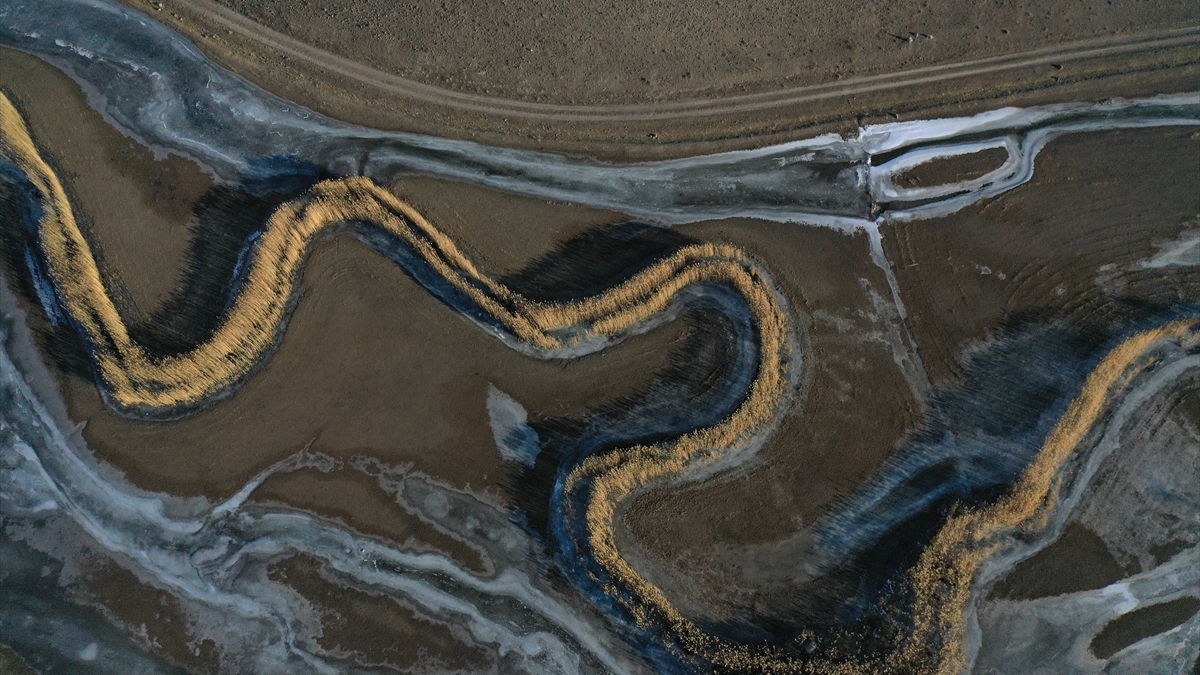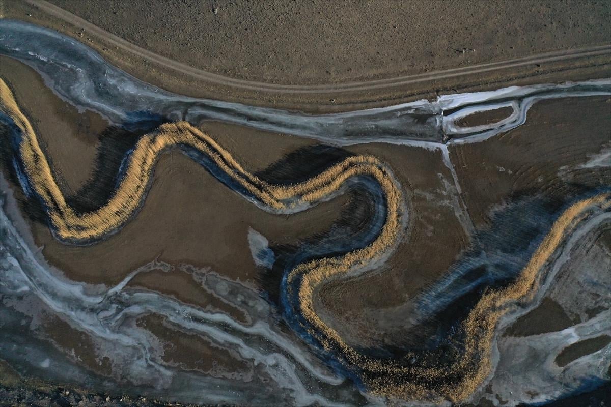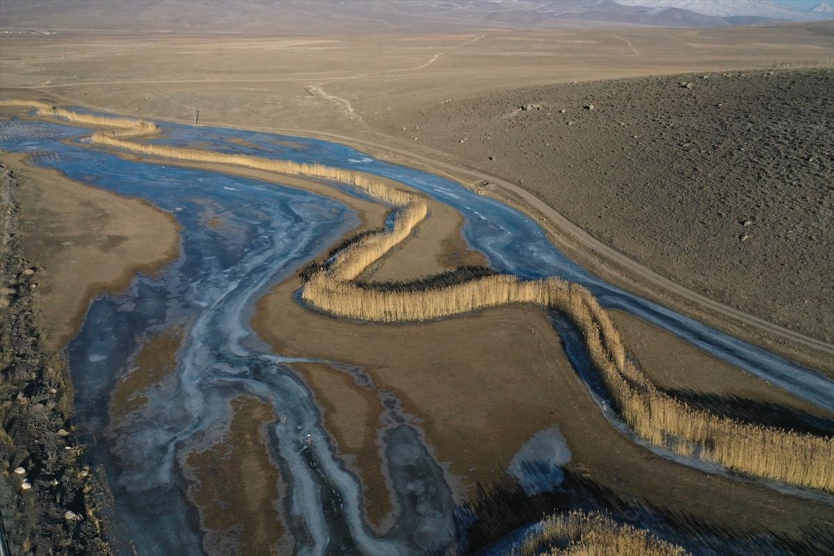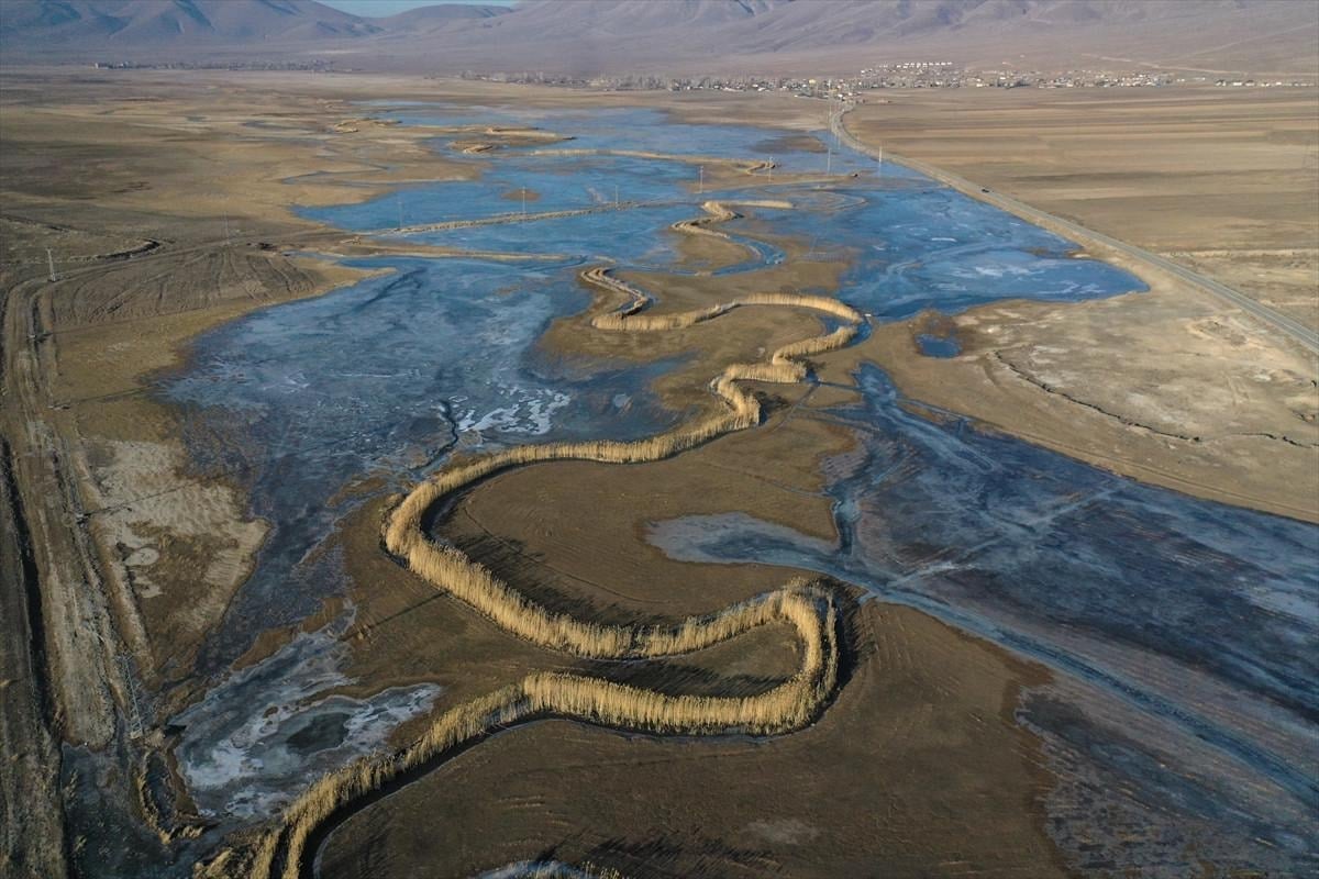 Ağrı'da geniş bir alana yayılan araziden geçen nehirler soğuk nedeni ile dondu. Göz alabildiğine geniş bir alandaki suların donması karelere yansıdı.