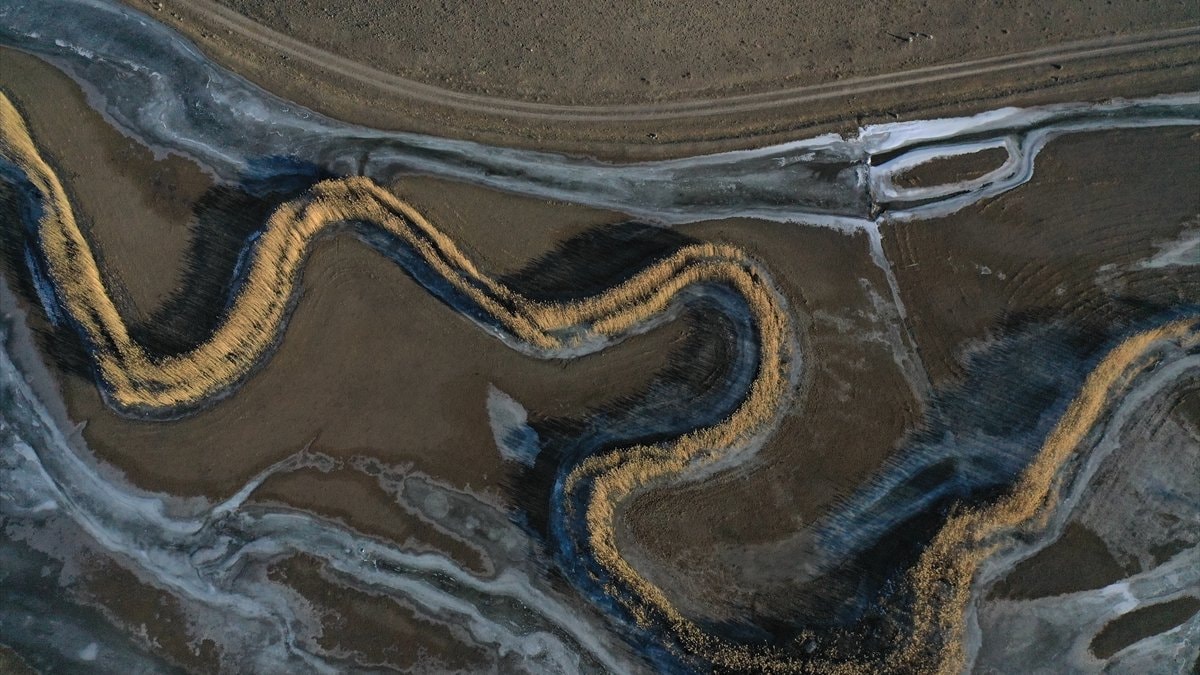 Yüzeyi buzla kaplanan alanlar drone ile görüntülendi.