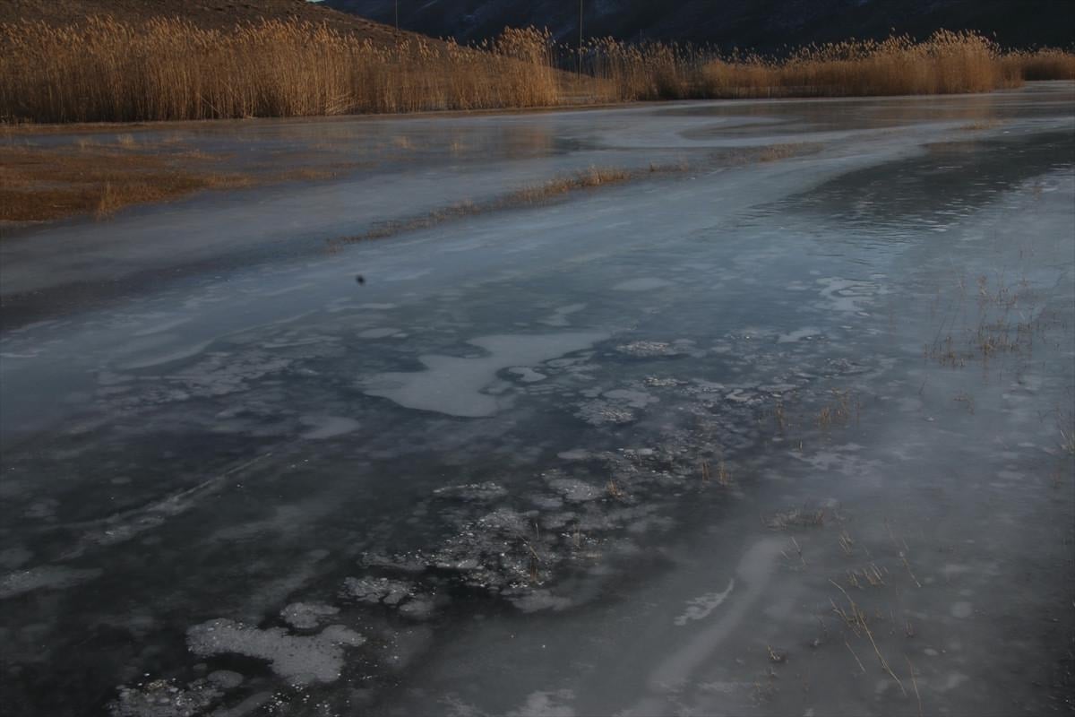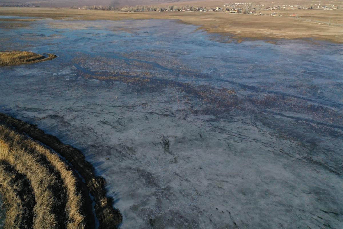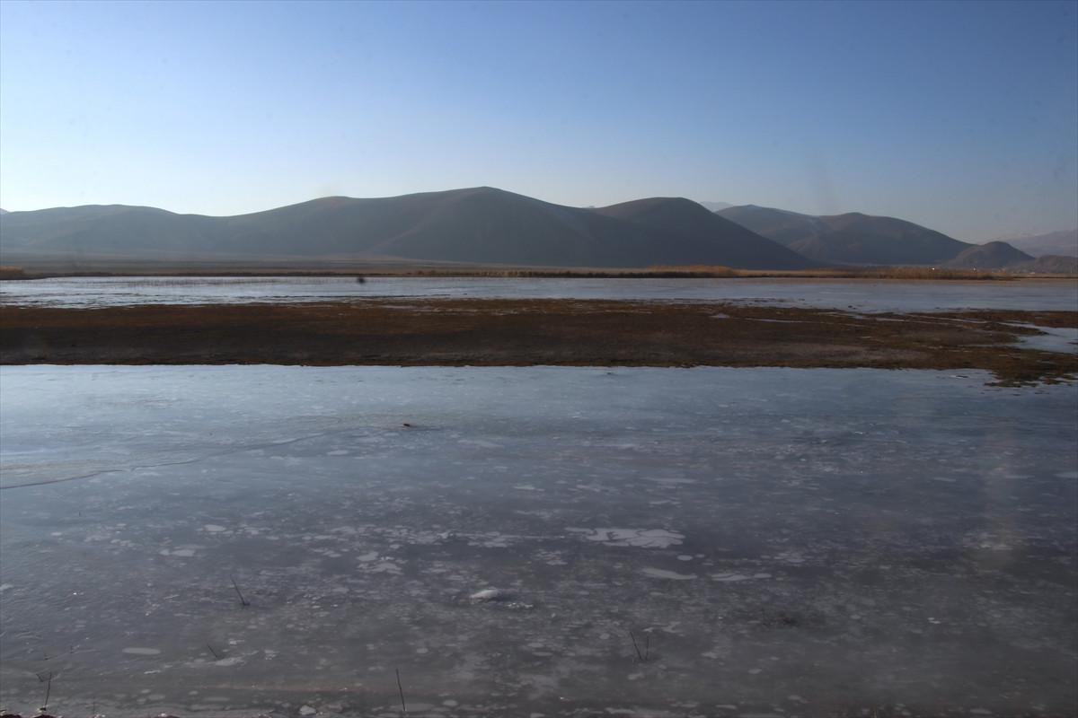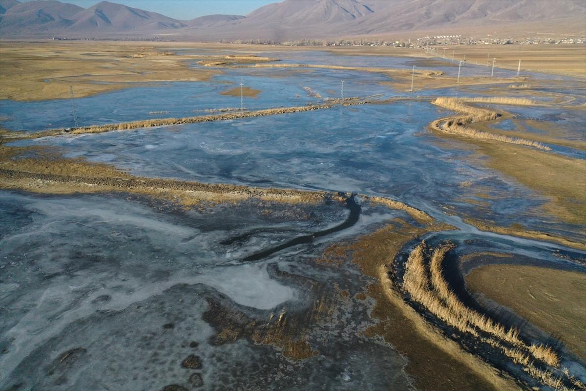 Ağrı'nın Doğubayazıt ilçesinde geniş alana yayılan sulak alanlar buzla kaplandı.
