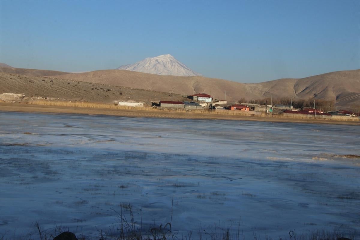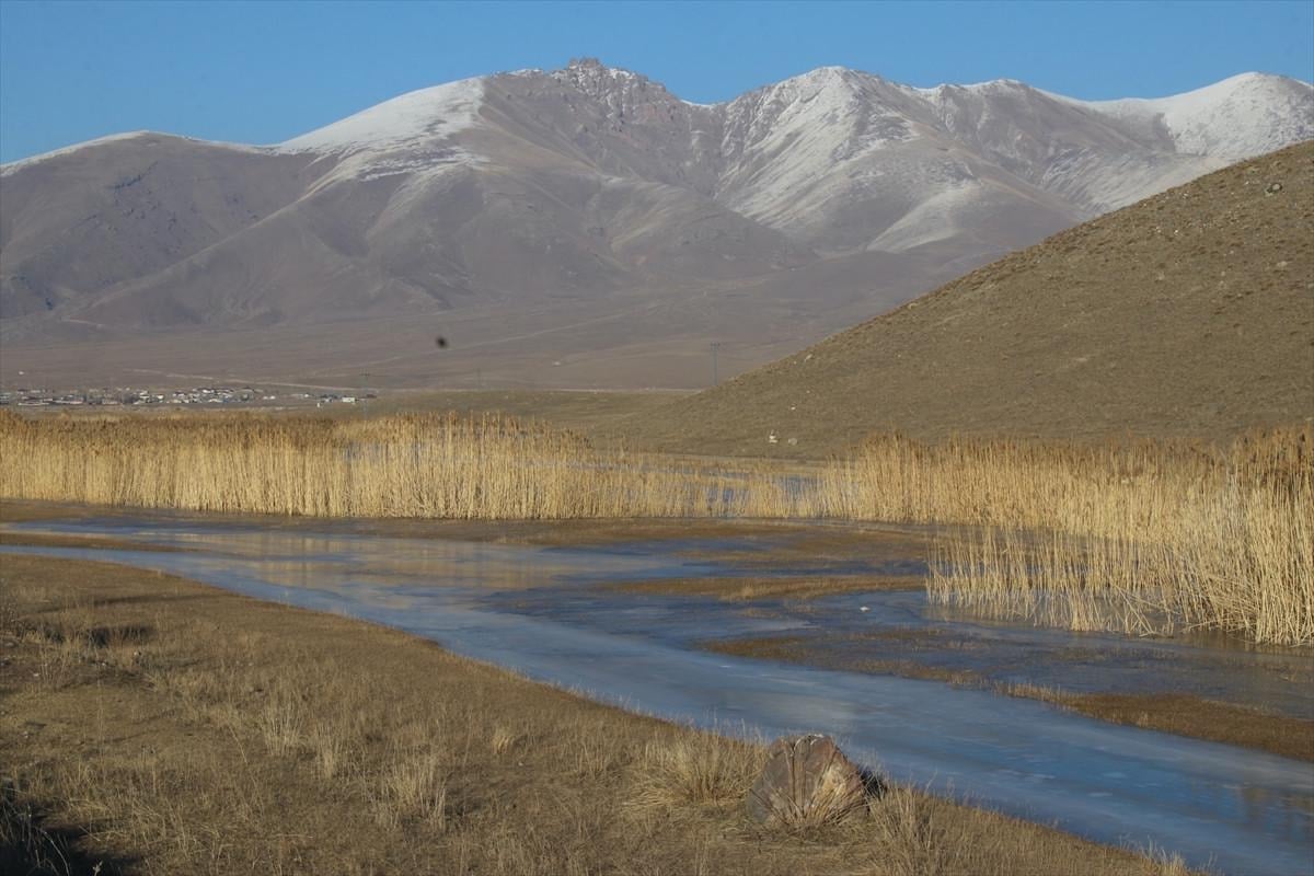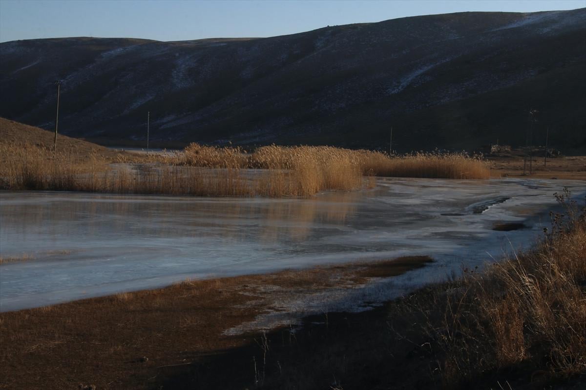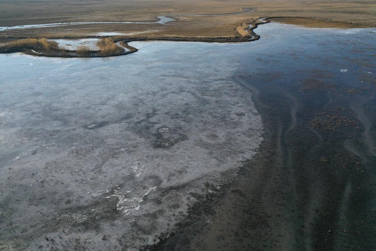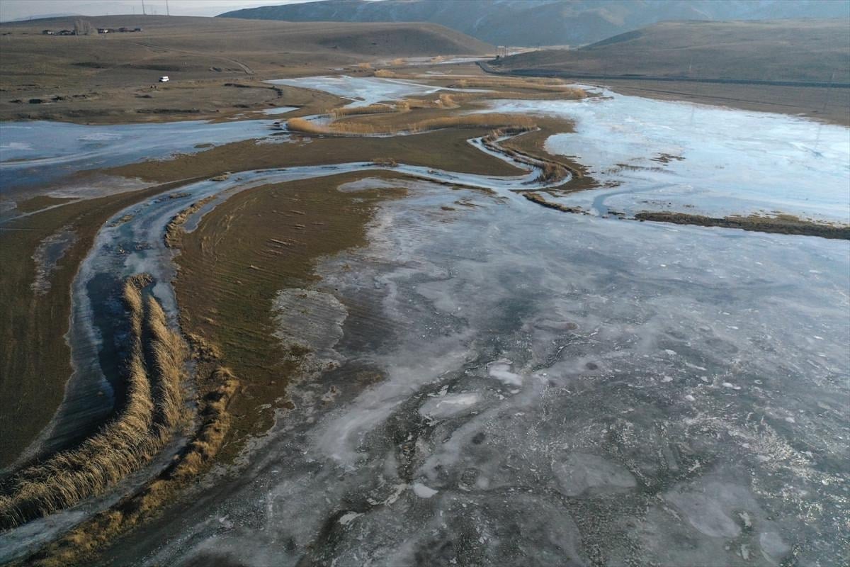 Ağrı'nın Doğubayazıt ilçesinde geniş alana yayılan sulak alanlar buzla kaplandı.