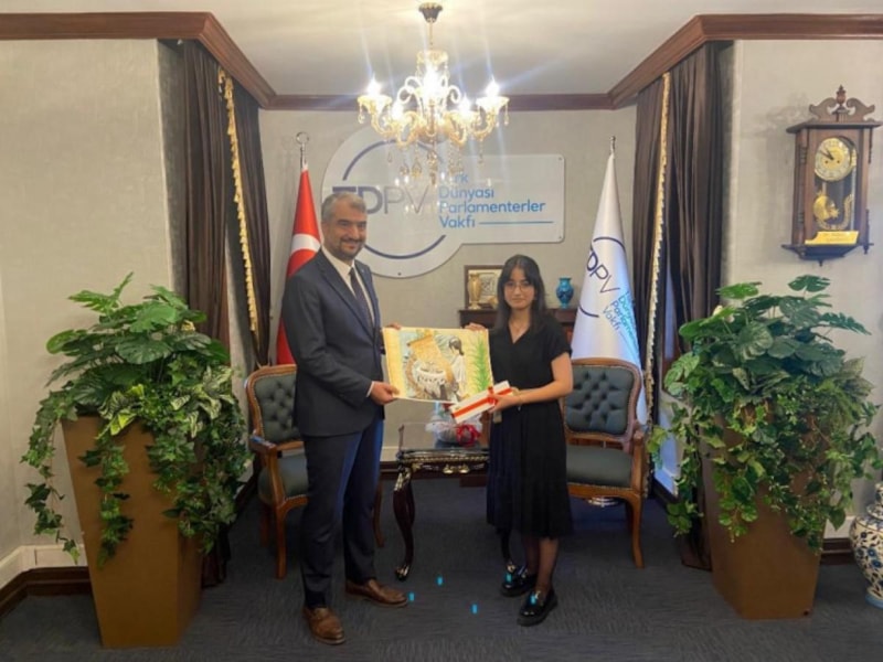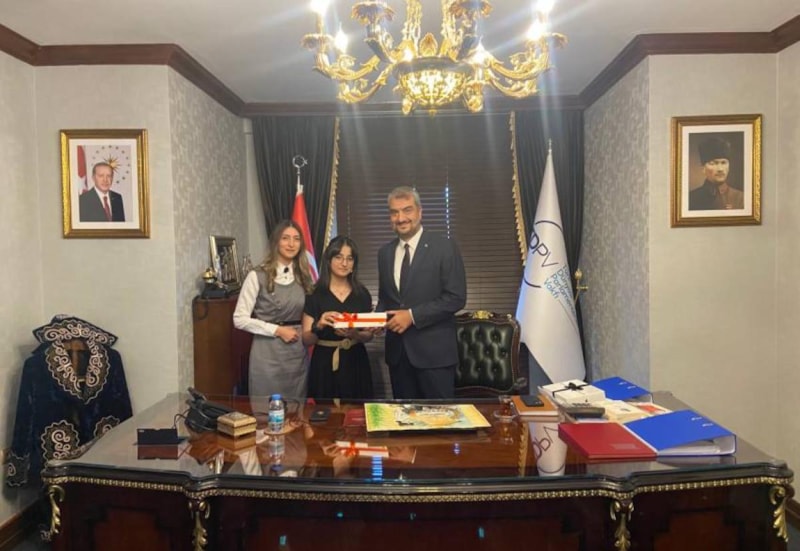 Resim dalında Ankara’dan dereceye giren ortaokul öğrencisi Yağmur Sena Çeken ve lise öğrencisi Yağmur Güçlü'ye ödüllerini Vakıf Başkanı Dr. Abdullah Çalışkan, Vakıf Genel Merkezinde bizzat verdi.