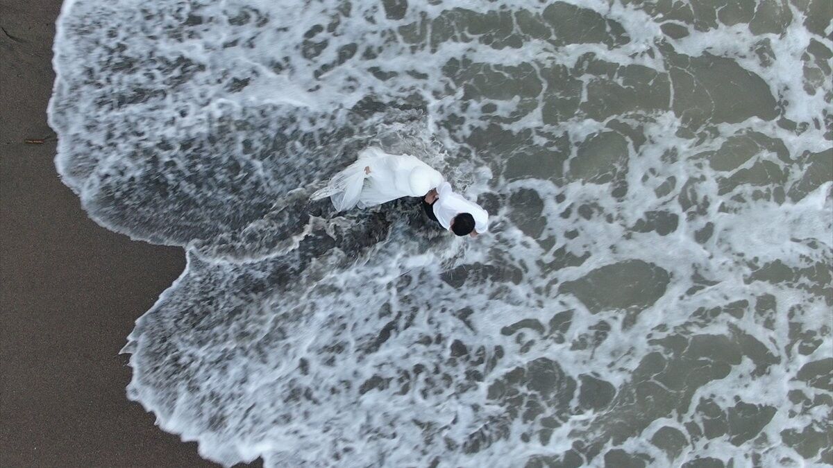 Akşam saatlerinde kumsala inen gelin ve damadın gün batımına kadar çekimleri yapılırken, özellikle denizde çekilen fotoğraflar beğeni topluyor.