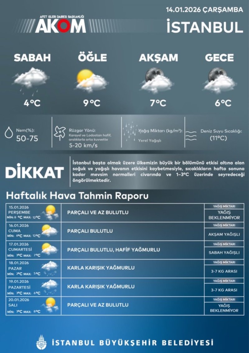 Meteoroloji Genel Müdürlüğü ve İstanbul Büyükşehir Belediyesi Afet Koordinasyon Merkezi (AKOM), yeni hafta için hava raporlarını paylaştı.