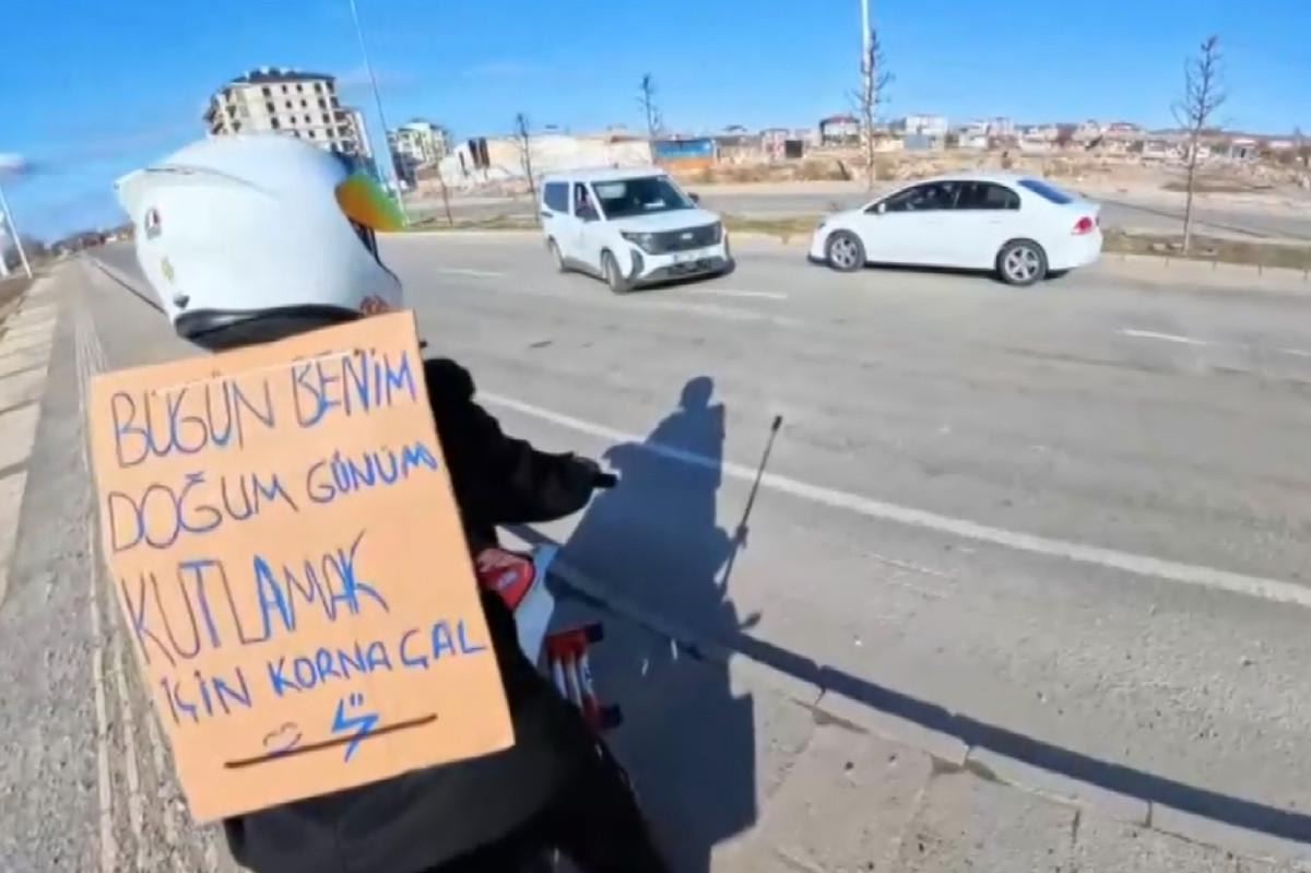 Bir kartona “Bugün benim doğum günüm, kutlamak için korna çal” yazıp sırtına asan Bedirhan, o halde tarfikte seyretmeye başladı.