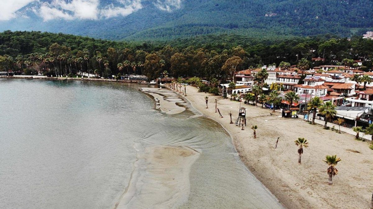 Muğla'nın Ula ilçesindeki Akyaka sahilinde deniz suyu kıyıdan yaklaşık 40 metre çekildi.