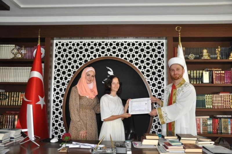 Kur'an-ı Kerim tilavetiyle başlayan ihtida merasiminde İlçe Müftüsü Vekili Mehmet Fatih Arslan tarafından İslam dininin temel esasları hakkında anne Natalia ile kızı Sofia'ya bilgiler verildi.