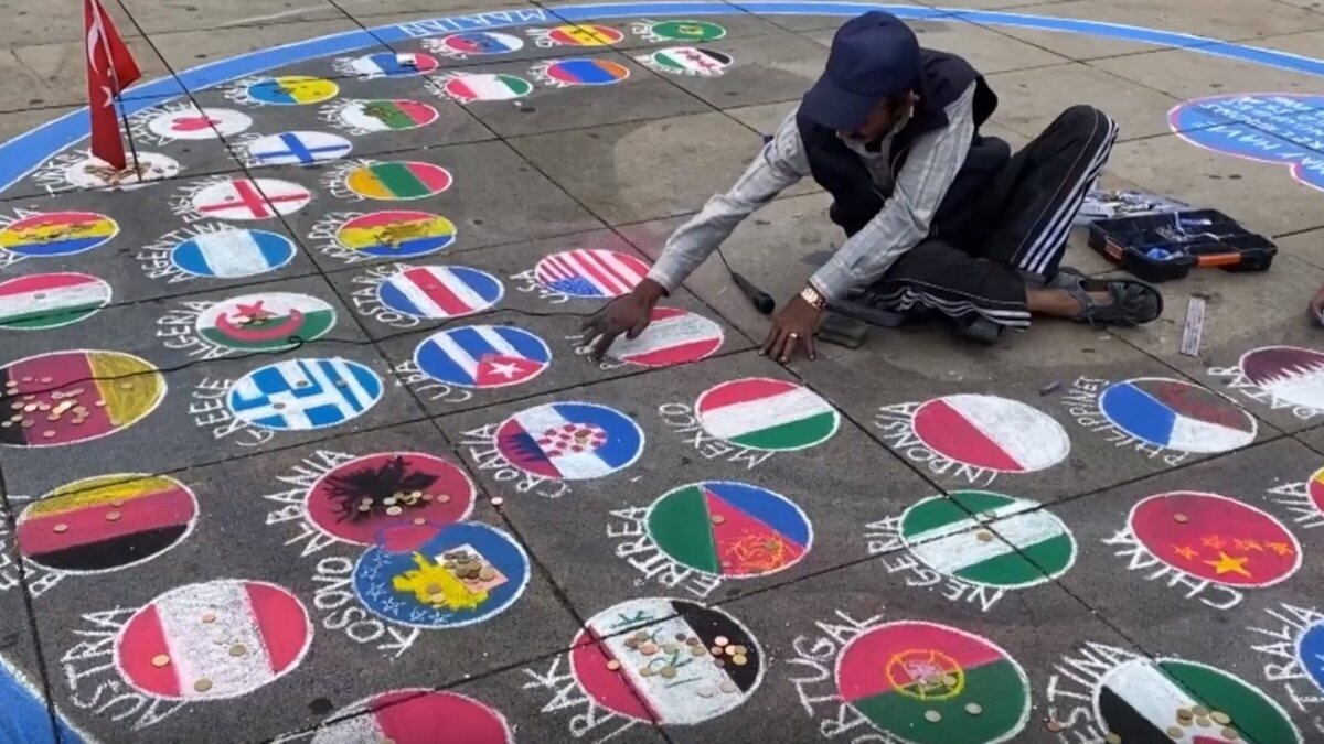Almanya Berlin'deki sokak sanatçısı Marian, ülke bayraklarını önemli meydanlara çiziyor. Romanya'dan gelen Marian, geçimini de bu yolla sağlıyor.