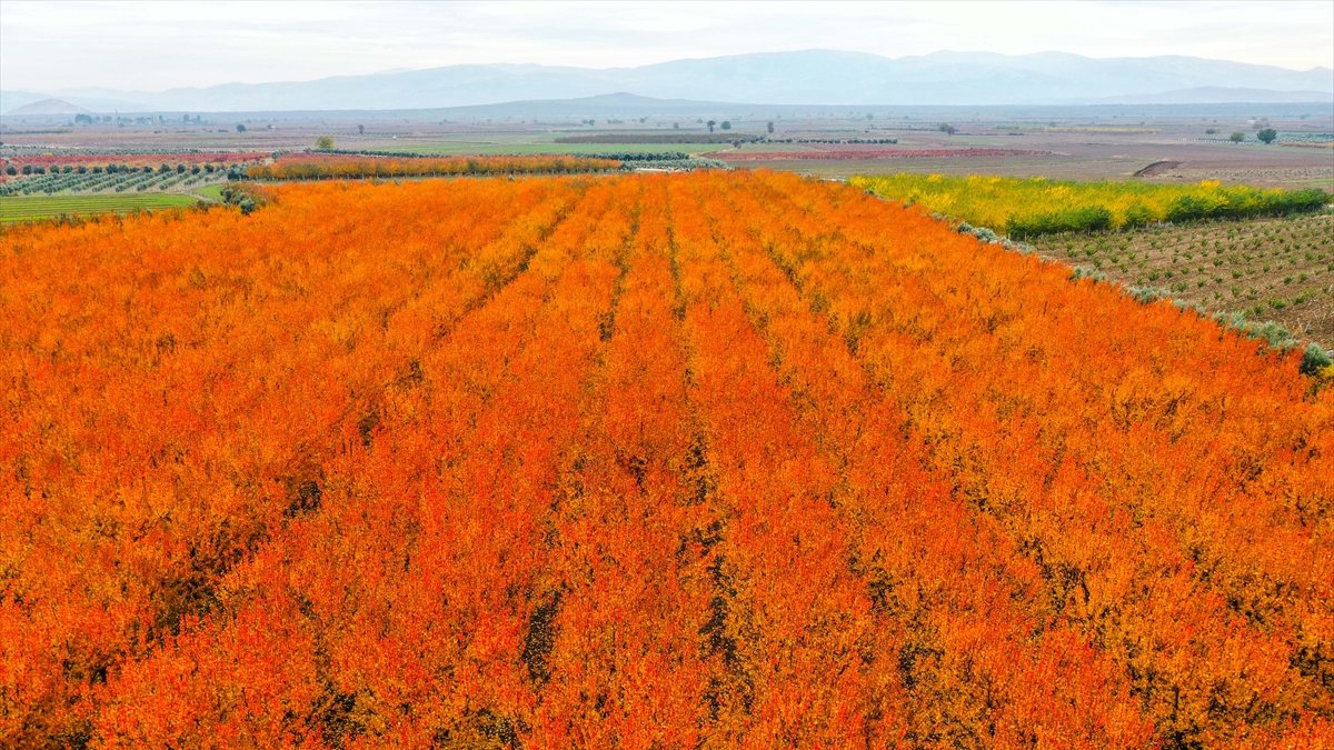 Amanos Dağları eteklerindeki Hatay'ın Hassa ilçe merkezi yakınlarında bulunan meyve bahçeleri, sonbahar renklerine büründü.