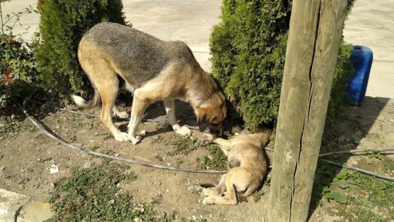 Kızılca köyünde anne köpek, bir aracın çarparak bacaklarını kırdığı yavrusunun başından ayrılmadı. Köpek ve yavrusunun o anları cep telefonu kamerasına yansıdı.