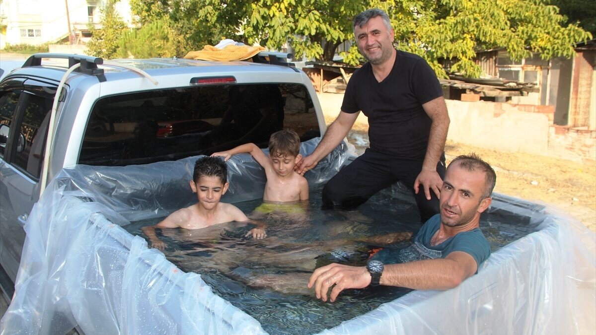 Tepe Mahallesi'nde ikamet eden Bozkurt, hem kendisi hem de çocuklarını serinletmek için pikap aracının kasasını naylon ile kaplayarak içine su doldurdu.
