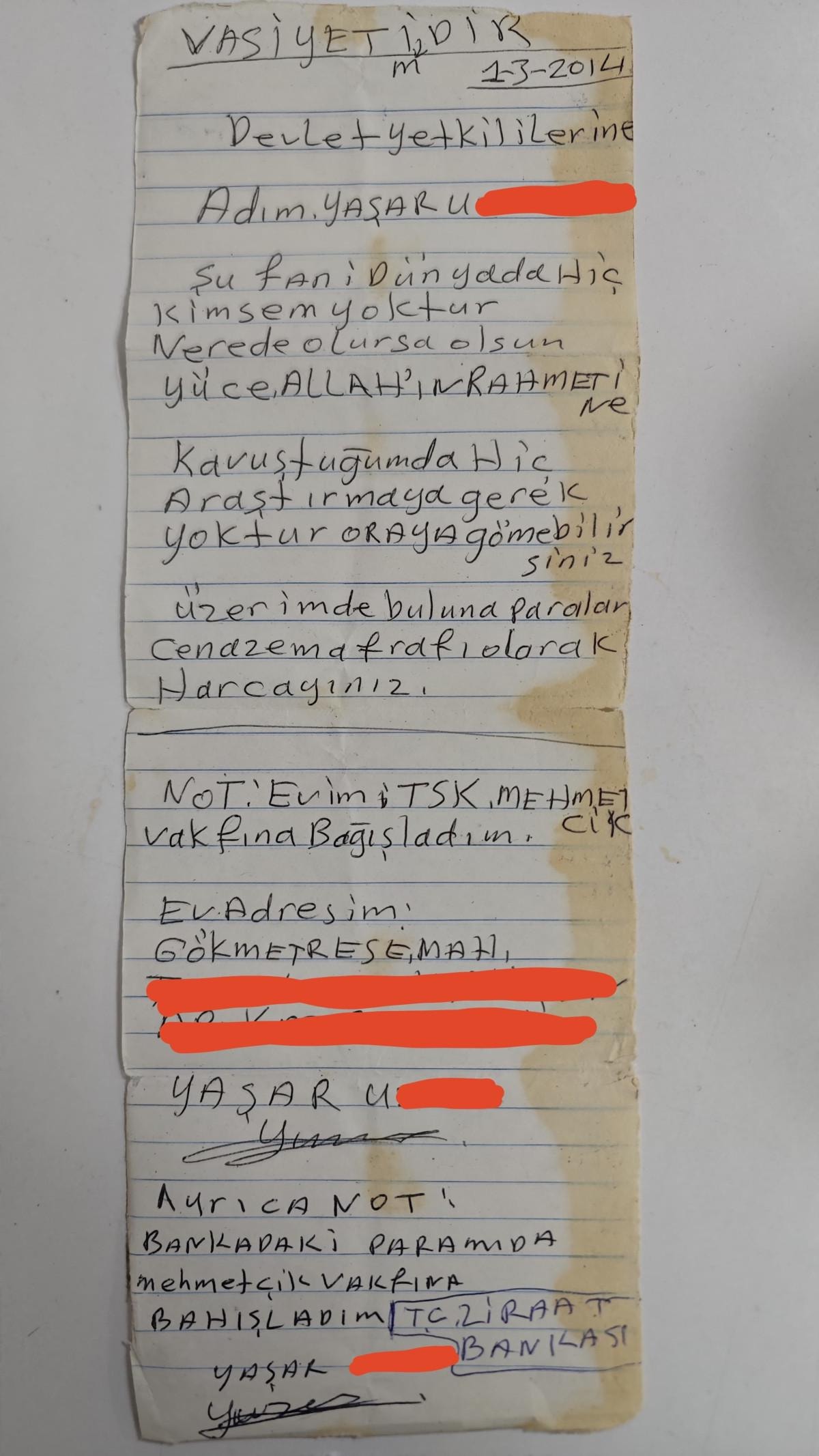 11 yıl önce yazılan notta, üstünden çıkan paranın cenaze masraflarında kullanılmasını isteyen Uzun'un Gökmedrese Mahallesi'ndeki evini ve bankadaki bir miktar parasını Mehmetçik Vakfı'na bağışladığının yazılı olduğu görüldü.