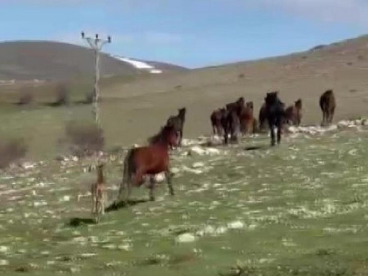 Amasya'nın Akdağ ilçesinde, yaklaşan araçların sesini duyan yılkı atı sürüsü, hızla doğal yaşam alanlarına doğru yöneldi. Sürünün içinde 20’den fazla atın yanı sıra yeni doğan tayların da olduğu dikkat çekti.