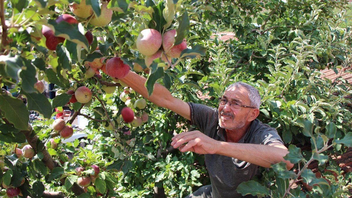 Bir ağaçta 6 çeşit elma yetiştiren Yılmaz, tamamen organik olan meyvelerinden müşterilerine ikram ediyor. Ağacın üst kısmındaki elmaları çatıya çıkarak toplayan Yılmaz, olgunlaşmayan meyvelerin kopartılmasına ise müsaade etmiyor.