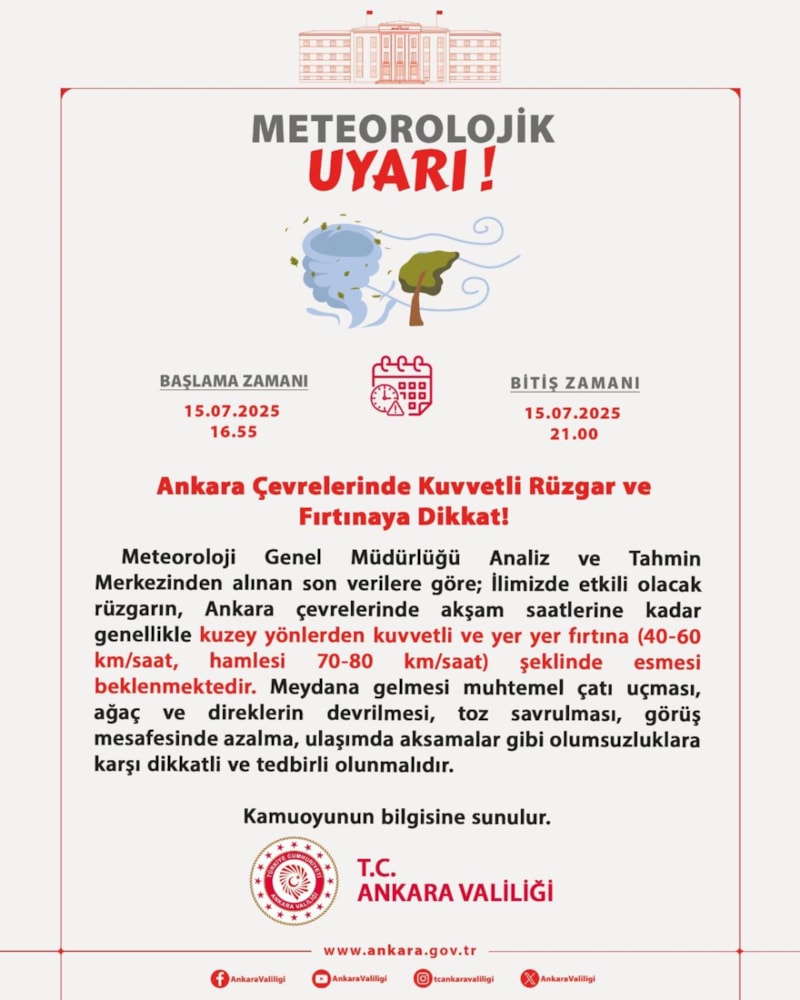 Ankara Valiliği, kentte etkili olması beklenen kuvvetli rüzgar ve fırtına için uyarıda bulundu.