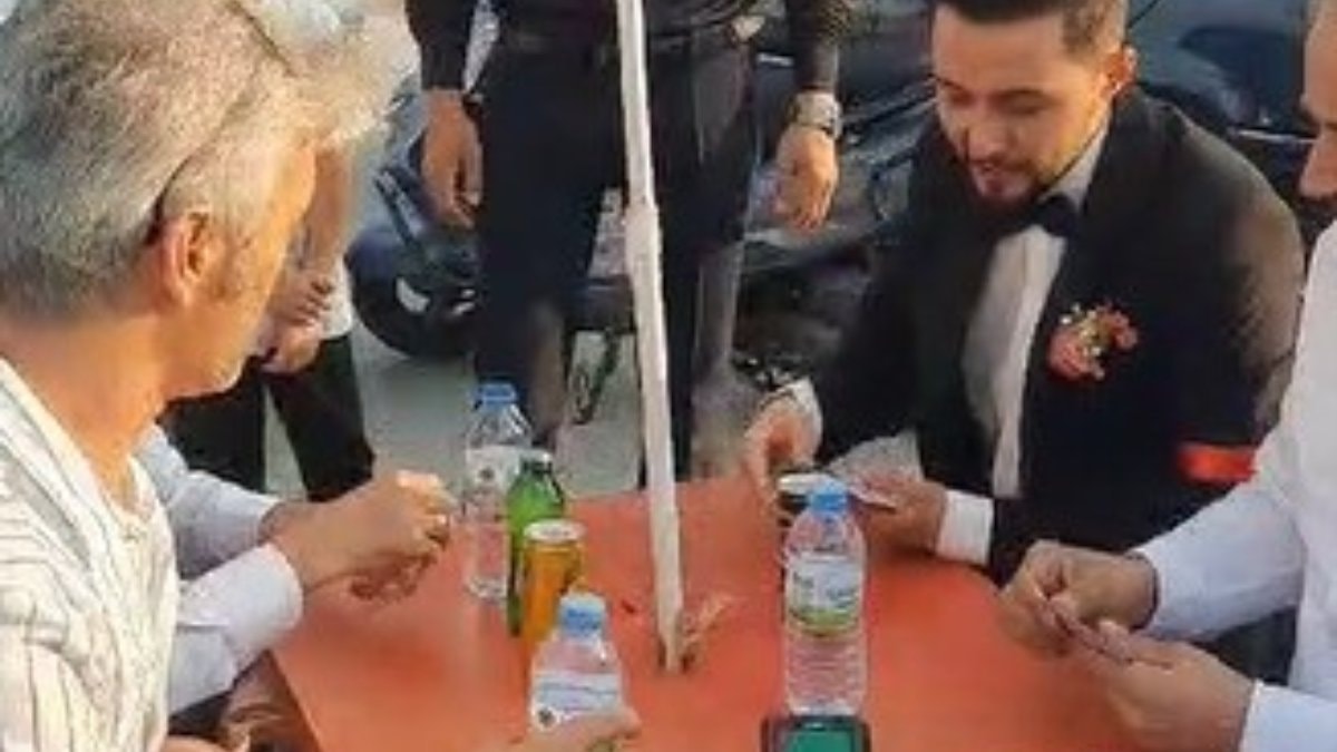 Pişti masasına oturan damat, bir süre arkadaşlarıyla birlikte pişti oynadı.
