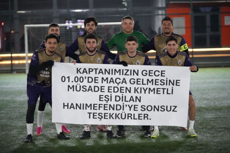 Halı saha maçına gitmek için eşinden son anda izin alabilen bir futbolcunun takım arkadaşları, açtıkları esprili pankartla bu izne karşılık teşekkür etti.